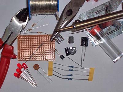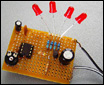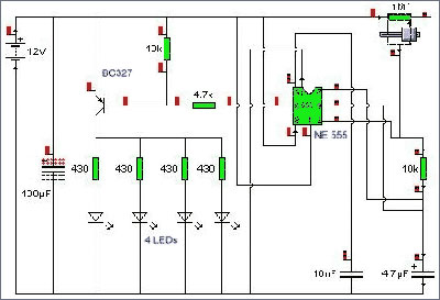 需要的电子零件:10k电阻x2、4.7k电阻x1、 430电阻x4、 电位器1Mx1、陶瓷电容器x1、 Elko4,7fx1、 Elko100fx1、 晶体管BC327x1、NE555x1、 IC插座x1、PCB空板x1。